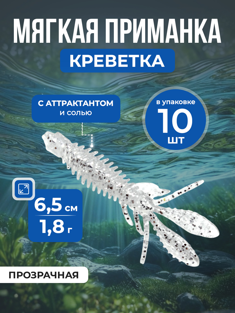 Рыболовная ароматизированная, соленая, плавающая мягкая приманка, имитация креветки для оснастки NED Rig Shrimp, 6,5см/1,8 г, 10 шт, прозрачная