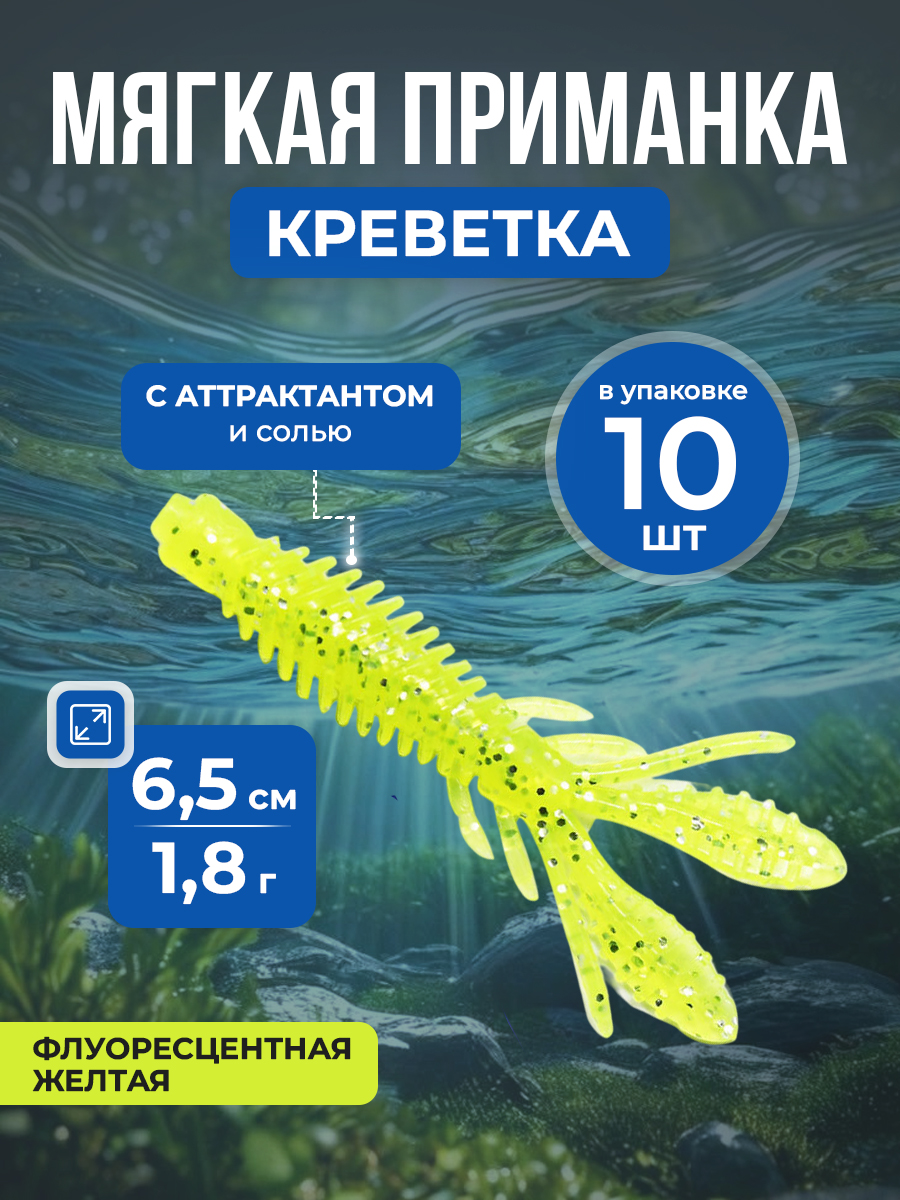 Рыболовная ароматизированная, соленая, плавающая мягкая приманка, имитация креветки для оснастки NED Rig Shrimp, 6,5см/1,8 г, 10 шт, флуоресцентная желтая