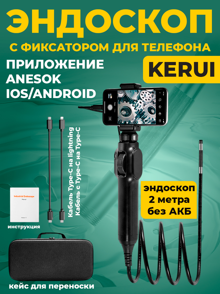 Эндоскоп KERUI c подвижной камерой, WI-FI, ANESOK, c фиксатором для телефона, аккумулятор, 5МП, 2 метра