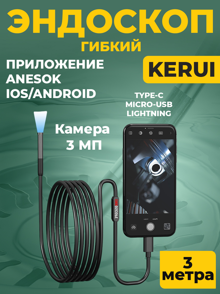 Эндоскоп для телефона KERUI, WI-FI, IOS, Android, type-c, microUSB, lightning, 3 метра