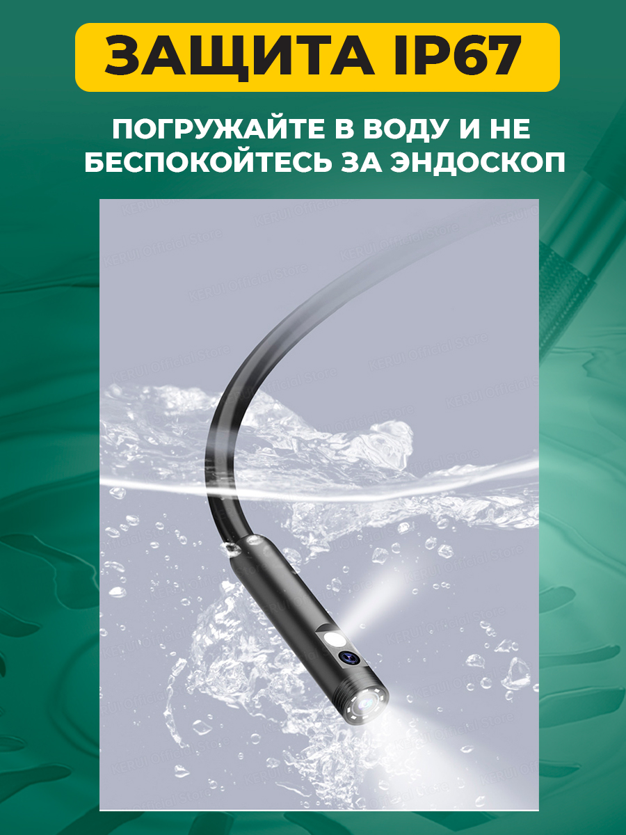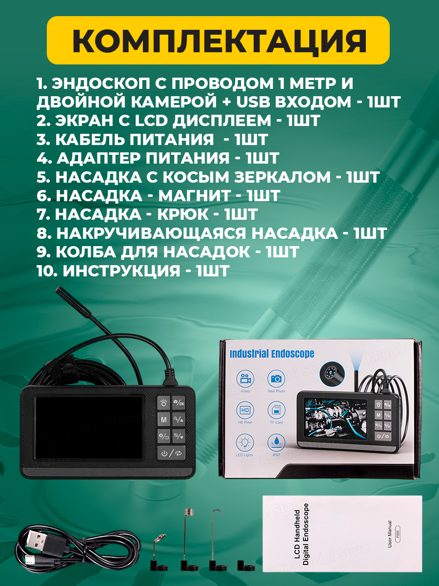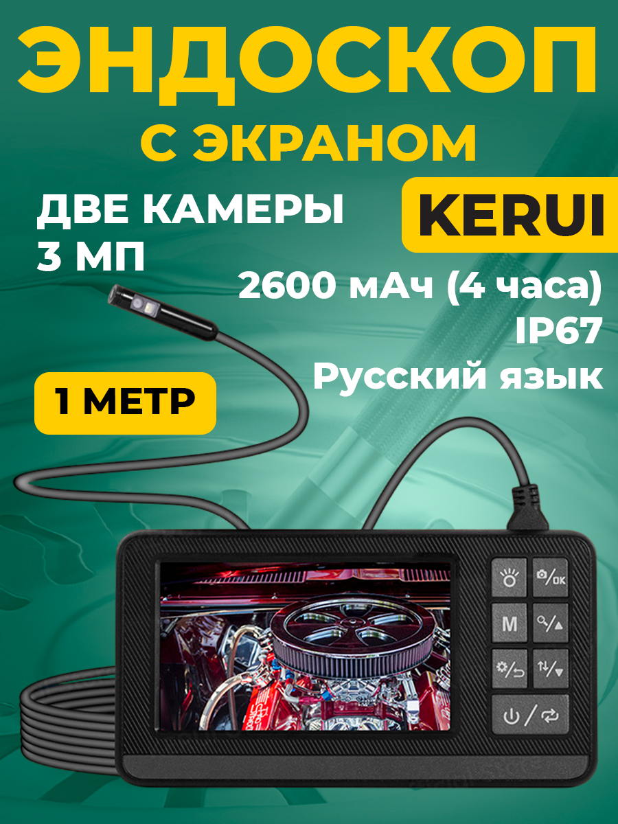 Представляем вам эндоскоп KERUI — идеальное решение для диагностики и осмотра труднодоступных мест как в медицине, так и в автомобильной сфере. Этот гибкий эндоскоп с дисплеем предназначен для автономной работы в различных сферах деятельности, таких как медицина, ремонт в сервисных центрах, выездной осмотр, бытовое и коммерческое применение. Эндоскоп KERUI оснащен двойной камерой, что позволяет вам делать фото и записывать видео в память монитора (при условии, что вставлена SD карта). А для труднодоступных мест гибкий эндоскоп оснащен подсветкой с восемью светодиодами, яркость которых можно регулировать в приложении при помощи отдельной кнопки. Эндоскоп имеет гибкий и длинный провод, который в то же время является жестким, что позволяет не беспокоиться о загибании провода в трубе или широком участке осмотра. Эндоскоп подходит для различных областей, включая медицину, шиномонтаж, автообслуживание, бытовых нужд, а также коммерческого применения. Вы сможете легко осмотреть детали вашего автомобиля, включая стартер и трубы, или применять устройство для медицинских исследований или сложных технических обследований. Эндоскоп имеет класс защищенности от воды IP65. Встроенный LCD экран имеет разрешение 1920 на 1080 точек. Данный прибор оснащен аккумулятором большой емкости, зарядка должна длится примерно 4 часа, а использовать эндоскоп после этого можно в течении 2-3 часов. Эндоскоп Kerui — это надежный помощник для профессионалов и любителей, которые ценят качество и удобство. Получите возможность детального осмотра всех необходимых объектов с помощью высококачественной камеры эндоскопа и различных насадок на камеру, поставляемых в комплекте с эндоскопом!