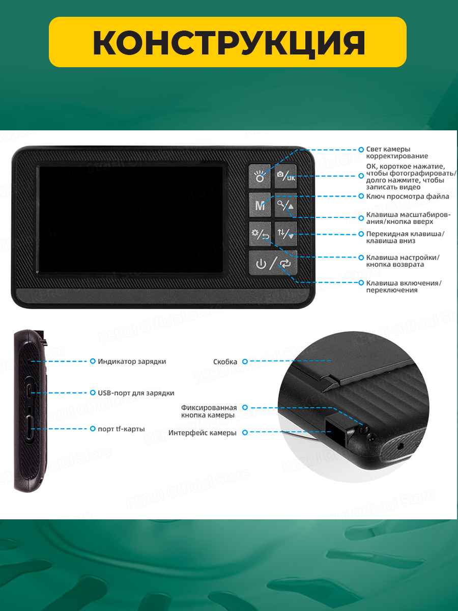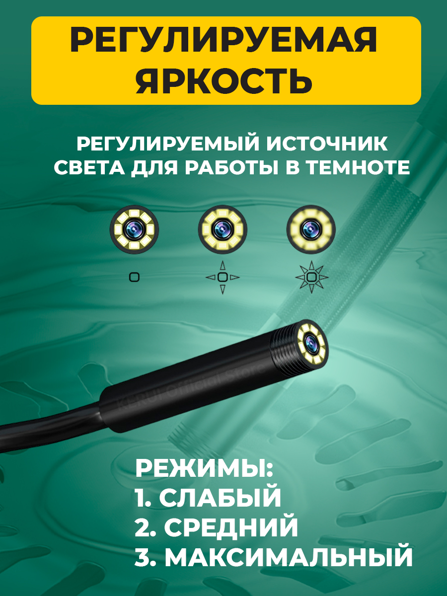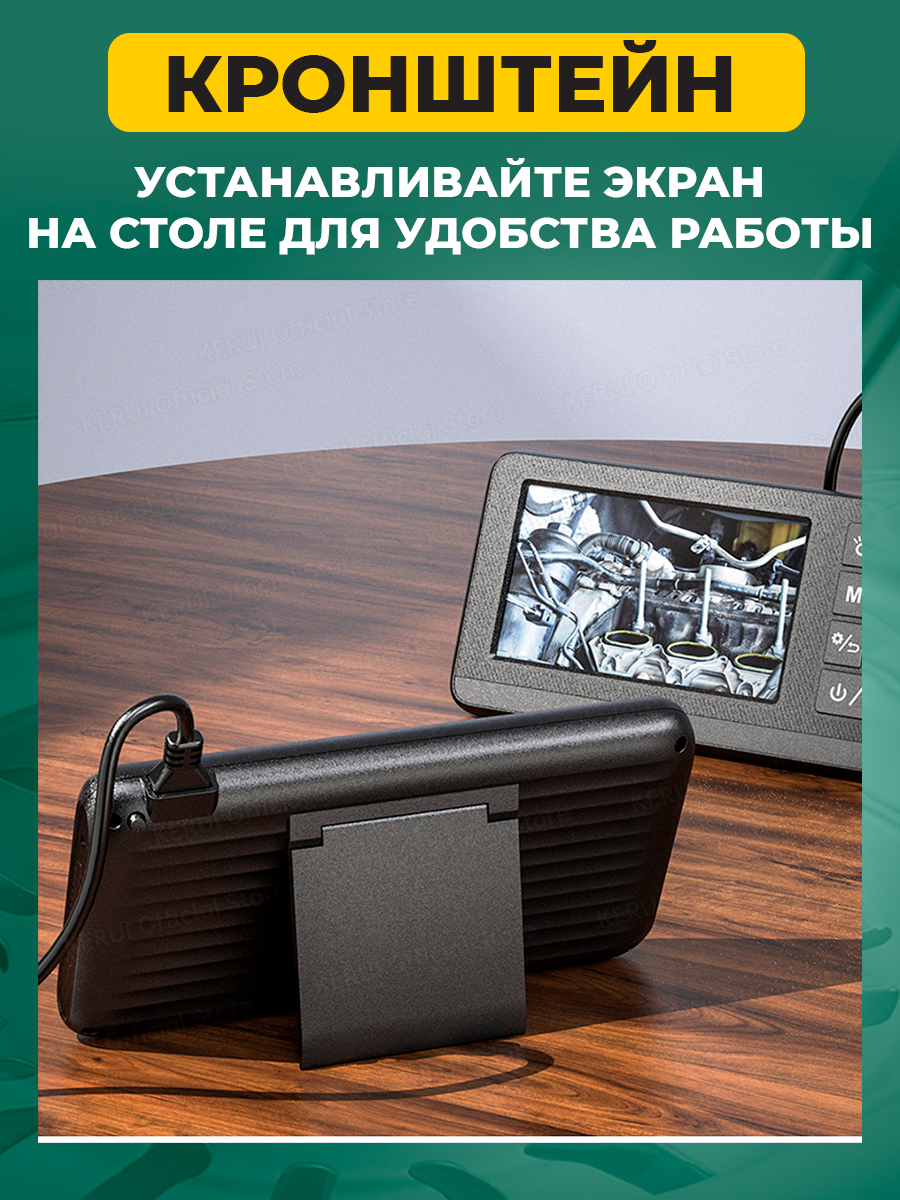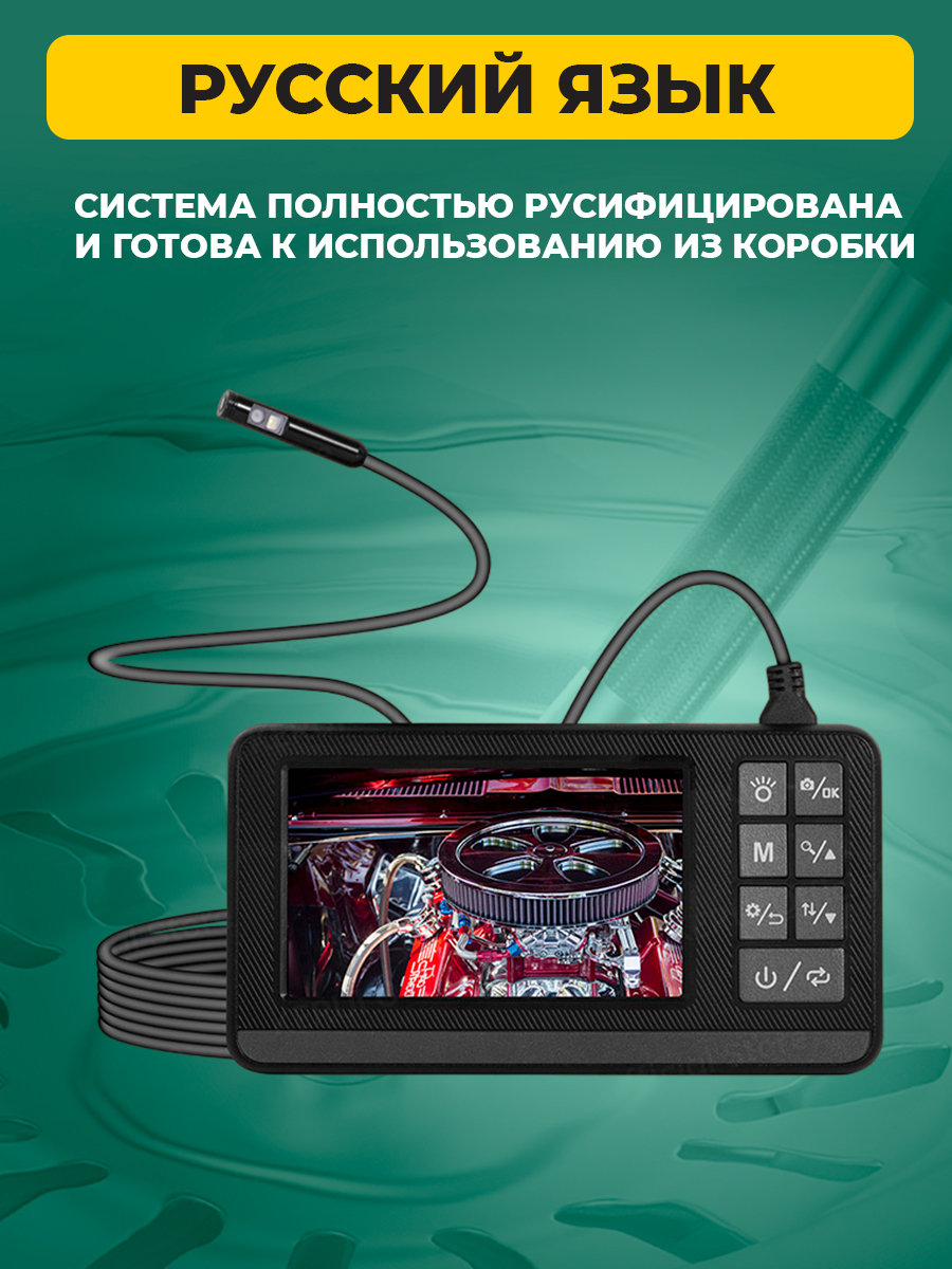Представляем вам эндоскоп KERUI — идеальное решение для диагностики и осмотра труднодоступных мест как в медицине, так и в автомобильной сфере. Этот гибкий эндоскоп с дисплеем предназначен для автономной работы в различных сферах деятельности, таких как медицина, ремонт в сервисных центрах, выездной осмотр, бытовое и коммерческое применение. Эндоскоп KERUI оснащен двойной камерой, что позволяет вам делать фото и записывать видео в память монитора (при условии, что вставлена SD карта). А для труднодоступных мест гибкий эндоскоп оснащен подсветкой с восемью светодиодами, яркость которых можно регулировать в приложении при помощи отдельной кнопки. Эндоскоп имеет гибкий и длинный провод, который в то же время является жестким, что позволяет не беспокоиться о загибании провода в трубе или широком участке осмотра. Эндоскоп подходит для различных областей, включая медицину, шиномонтаж, автообслуживание, бытовых нужд, а также коммерческого применения. Вы сможете легко осмотреть детали вашего автомобиля, включая стартер и трубы, или применять устройство для медицинских исследований или сложных технических обследований. Эндоскоп имеет класс защищенности от воды IP65. Встроенный LCD экран имеет разрешение 1920 на 1080 точек. Данный прибор оснащен аккумулятором большой емкости, зарядка должна длится примерно 4 часа, а использовать эндоскоп после этого можно в течении 2-3 часов. Эндоскоп Kerui — это надежный помощник для профессионалов и любителей, которые ценят качество и удобство. Получите возможность детального осмотра всех необходимых объектов с помощью высококачественной камеры эндоскопа и различных насадок на камеру, поставляемых в комплекте с эндоскопом!