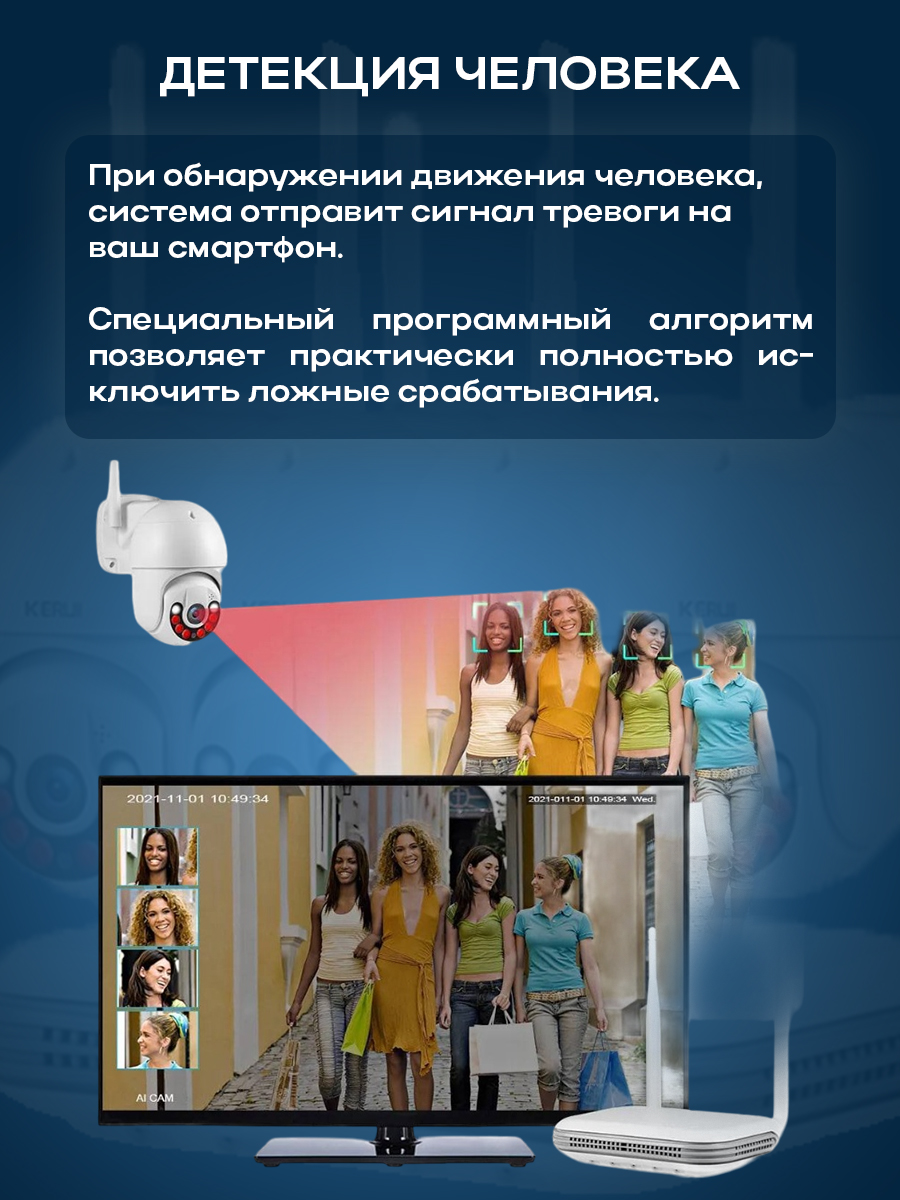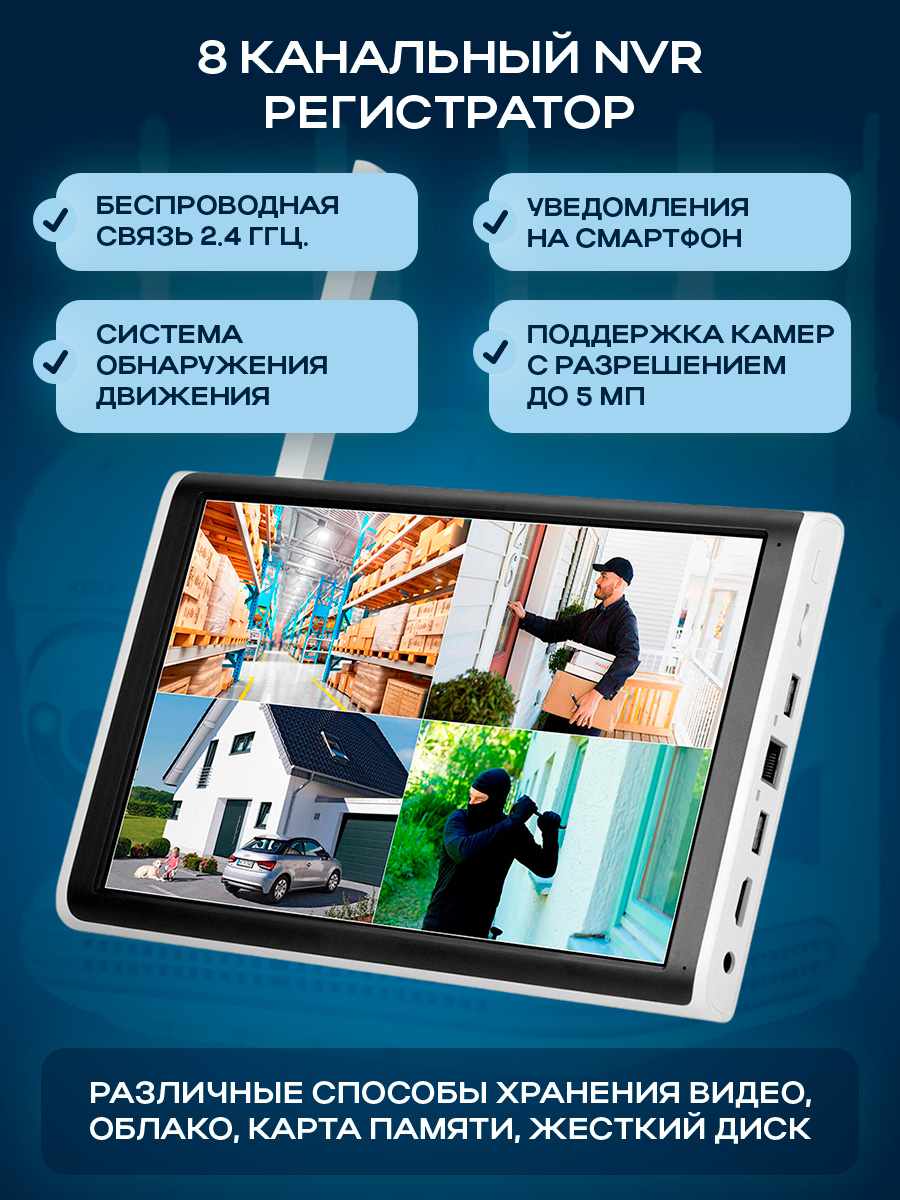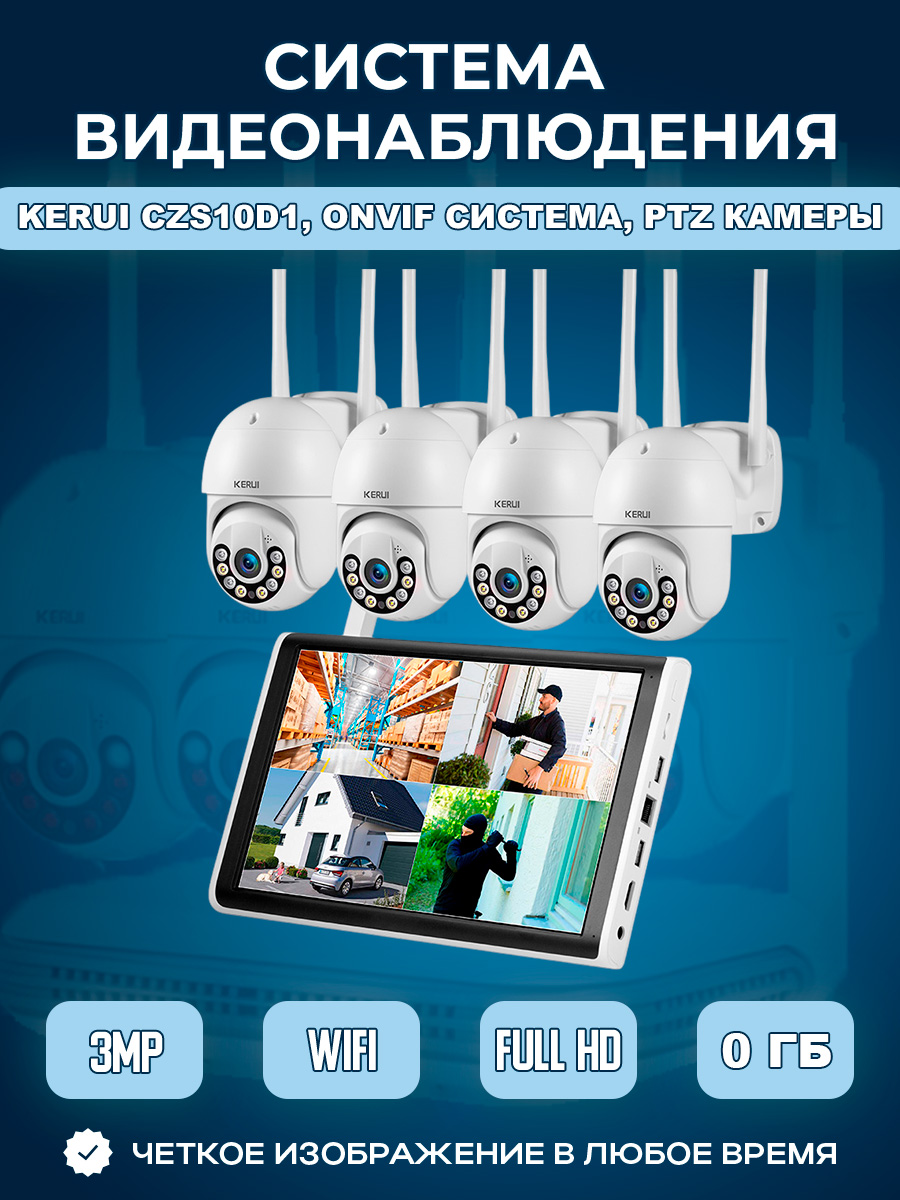 Комплект видеонаблюдения KERUI CZS10D1 c экраном PTZ камерами с одинарным объективами – это лучшее решение для организации видеонаблюдения на вашем объекте (доме, даче, офисе, складе, производстве, веранде). Камера вращается по горизонтали на 350 градусов, а по вертикали на 90 градусов. В комплект входит 8 канальный NVR регистратор (в виде планшета с жидкокристаллическим LCD экраном диагональю 10.1 дюйм и мышью) с поддержкой ONVIF (стандарт, обеспечивающий поддержку оборудования сторонних производителей), четыре камеры керуи с поддержкой WIFI, адаптер питания для регистратора, инструкция по эксплуатации, четыре набора крепежа для камер. Регистратор работает на базе процессора Mstar с операционной системой Linux, поддерживает отображение 1/4/9 камер, видео кодек H265+, аудио кодек G.711A и имеет встроенный динамик (микрофона нет). В регистратора имеется слот для HDD диска (который входит не во все комплектации, на главном слайде карточки товара отображена встроенная память того или иного набора) и для microSD карты. Запись можно на HDD или в облако (платно). Регистратор системы видеонаблюдения имеет следующие интерфейсы: один RJ45 10M/100M (это Ethernet порт для подключения интернета), 8-канальный внутренний интерфейс WIFI, USB порт для подключения мышки, слот для SD карты для резервного копирования, HDMI-порт для подключения внешнего монитора большего размера. Данный комплект — это инновационное «коробочное решение» для установки видеонаблюдения своими руками. Камеры оснащены встроенной инфракрасной подсветкой для съемки в темноте. Комплект поддерживает удаленный доступ со смартфона и компьютера (при наличии подключения к сети Интернет), при этом просматривать можно как архив записей, так и видео в «реальном» времени.