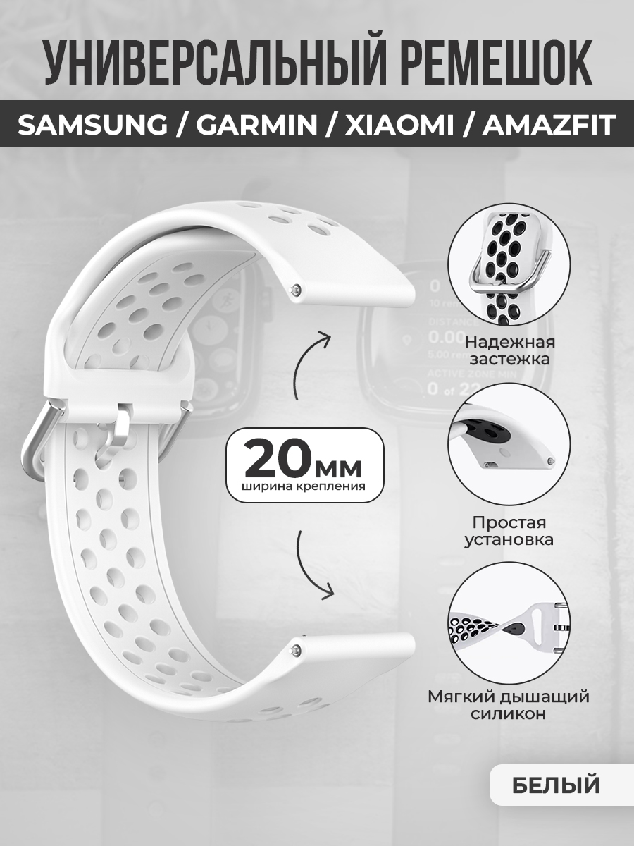 Универсальный ремешок для Samsung, Garmin, Xiaomi, Amazfit, 20 мм, белый
