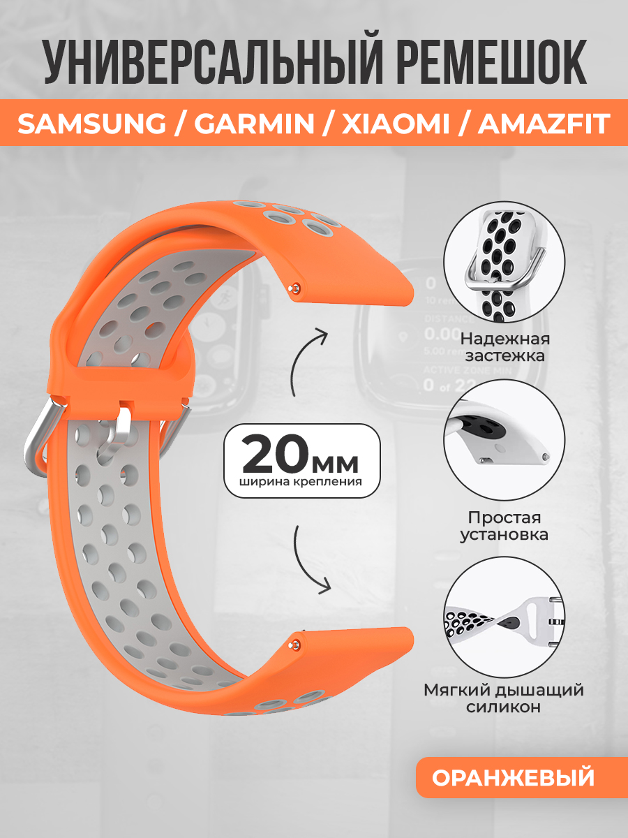 Универсальный ремешок для Samsung, Garmin, Xiaomi, Amazfit, 20 мм, серо-оранжевый