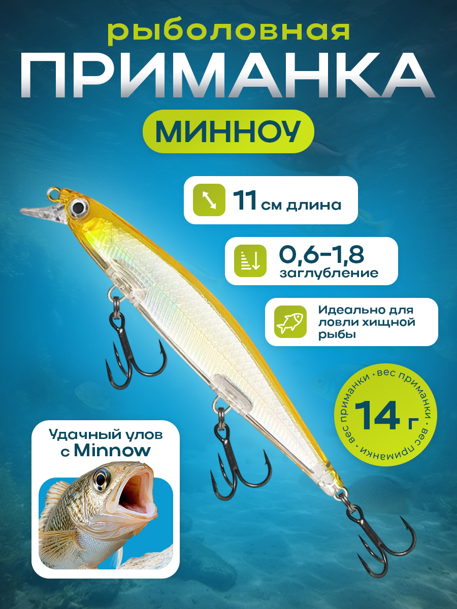 Размер 11 см делает Минноу универсальным инструментом как для захвата крупных, так и для подач рыбы помельче, что особенно полезно при ловле окуня и сибаса на поверхностную проводку. Вес 14 г указывает на оптимальное соотношение массы и подводного сопротивления, обеспечивая точное и дальнее забросы. Материал воблера выбран с целью устойчивости к механическим воздействиям и долговечности в разных водоемах и условиях ловли. Нагруженные тройники дают уверенность в захвате рыбы, снижая риск схода приманки в момент подсечки, что особенно важно при ловле осторожных и осторожных видов рыбы на поверхности.