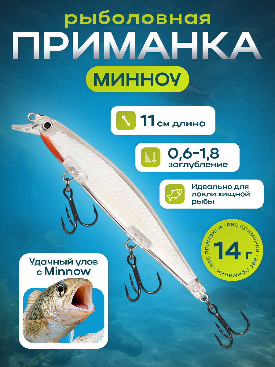 Размер 11 см делает Минноу универсальным инструментом как для захвата крупных, так и для подач рыбы помельче, что особенно полезно при ловле окуня и сибаса на поверхностную проводку. Вес 14 г указывает на оптимальное соотношение массы и подводного сопротивления, обеспечивая точное и дальнее забросы. Материал воблера выбран с целью устойчивости к механическим воздействиям и долговечности в разных водоемах и условиях ловли. Нагруженные тройники дают уверенность в захвате рыбы, снижая риск схода приманки в момент подсечки, что особенно важно при ловле осторожных и осторожных видов рыбы на поверхности.