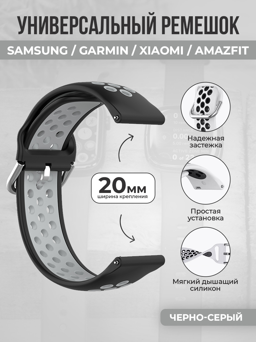Универсальный ремешок для Samsung, Garmin, Xiaomi, Amazfit, 20 мм, черно-серый