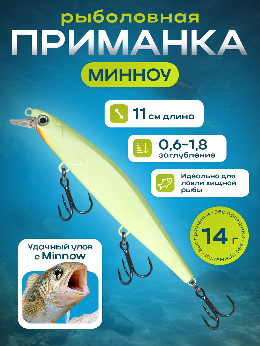 Размер 11 см делает Минноу универсальным инструментом как для захвата крупных, так и для подач рыбы помельче, что особенно полезно при ловле окуня и сибаса на поверхностную проводку. Вес 14 г указывает на оптимальное соотношение массы и подводного сопротивления, обеспечивая точное и дальнее забросы. Материал воблера выбран с целью устойчивости к механическим воздействиям и долговечности в разных водоемах и условиях ловли. Нагруженные тройники дают уверенность в захвате рыбы, снижая риск схода приманки в момент подсечки, что особенно важно при ловле осторожных и осторожных видов рыбы на поверхности.