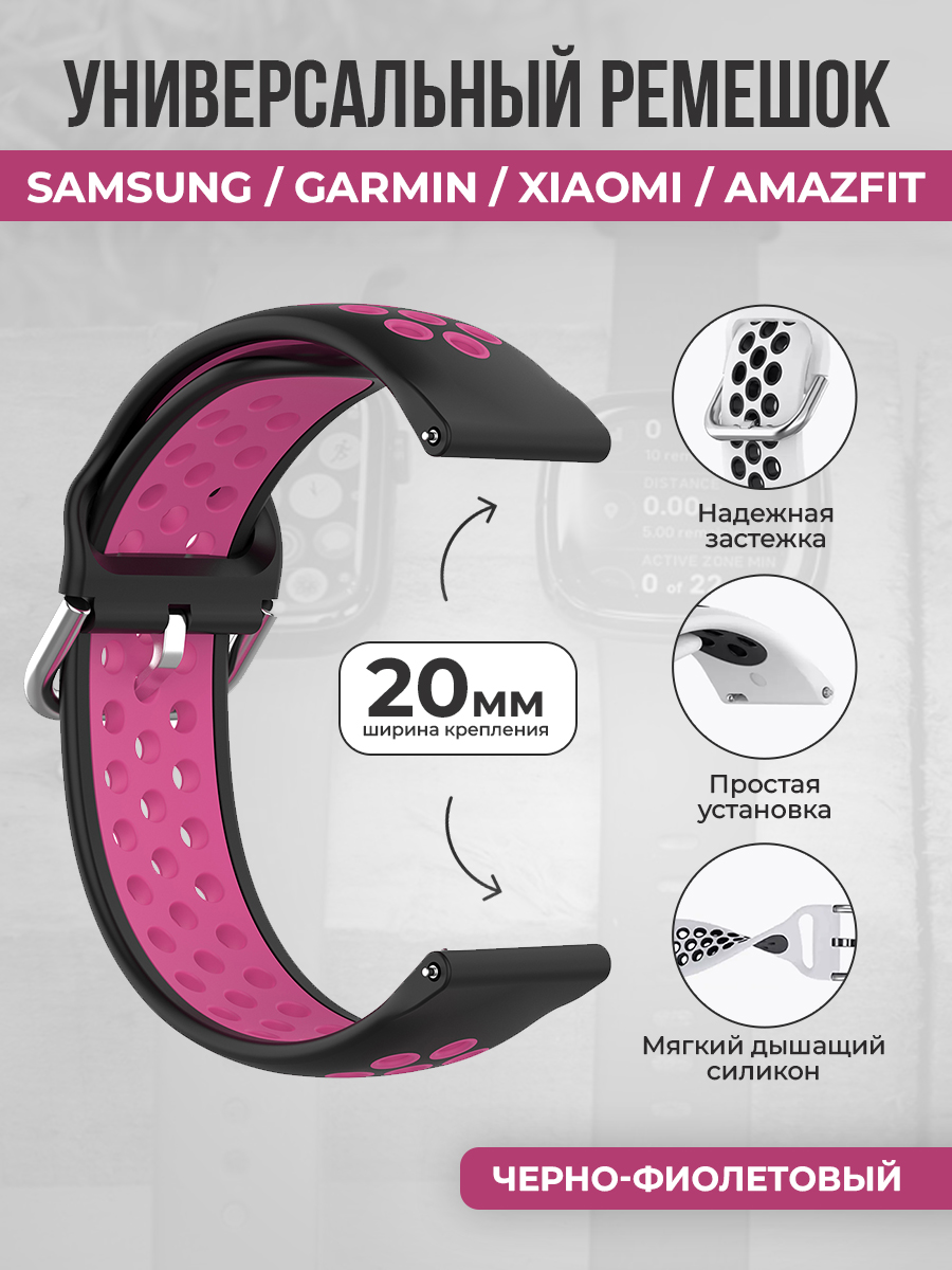 Универсальный ремешок для Samsung, Garmin, Xiaomi, Amazfit, 20 мм, черно-фиолетовый