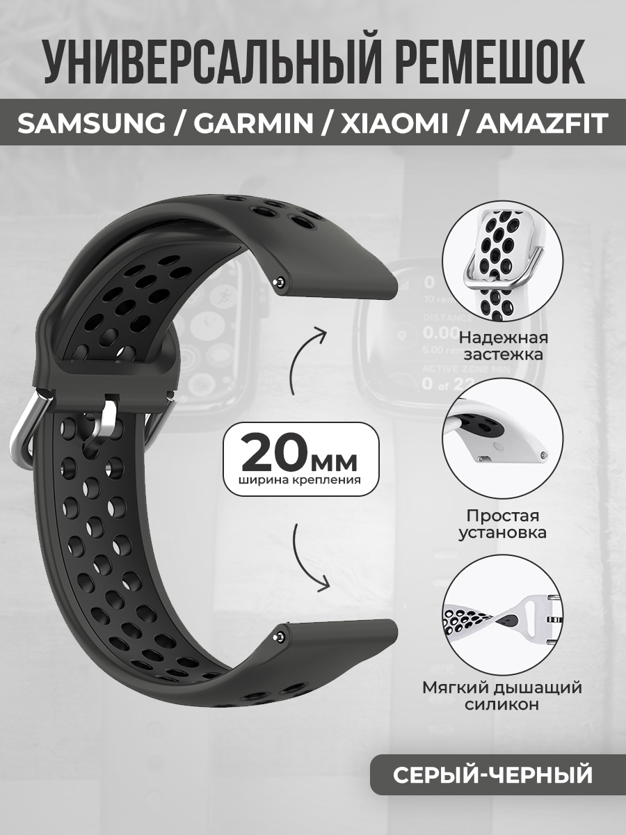 Универсальный ремешок для Samsung, Garmin, Xiaomi, Amazfit, 20 мм,темно-серый-черный