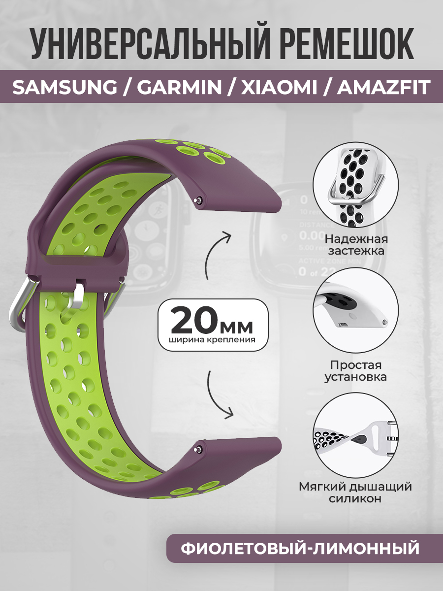 Универсальный ремешок для Samsung, Garmin, Xiaomi, Amazfit, 20 мм, фиолетовый-лимонный