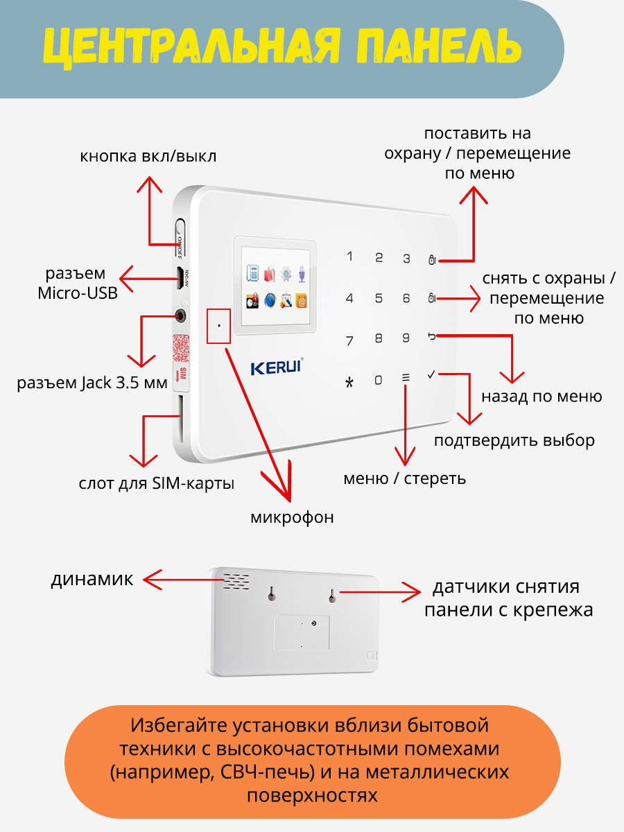 Наличие, либо отсутствие интернета, вовсе не является ограничением для работы данной модели. Как и все традиционные охранные системы при активации тревоги, сигнализация мгновенно рассылает СМС сообщения и обзванивает список доверенных телефонов. В режиме голосового управления можно снимать/ставить под охрану, прослушивать обстановку в помещении через встроенный микрофон или поговорить с посетителем через голосовой динамик центральной панели.