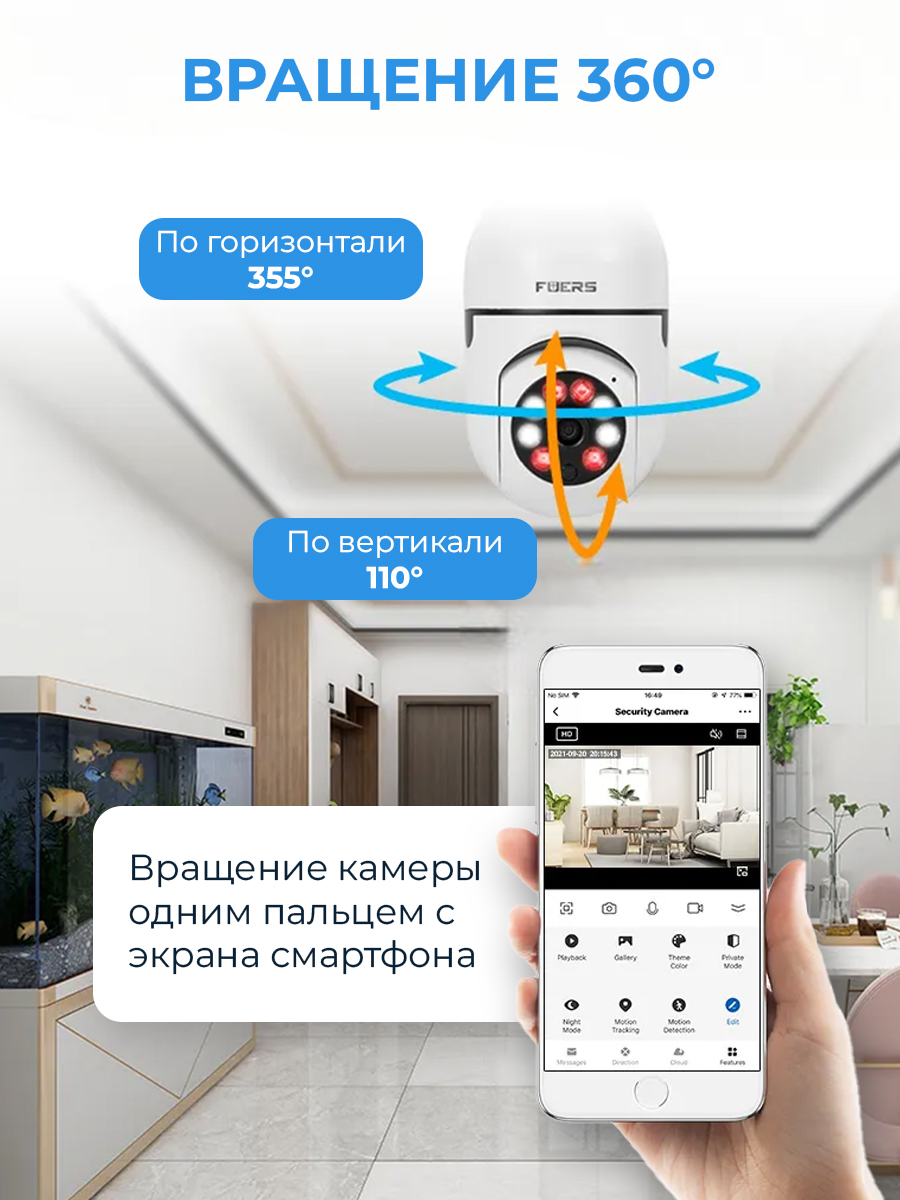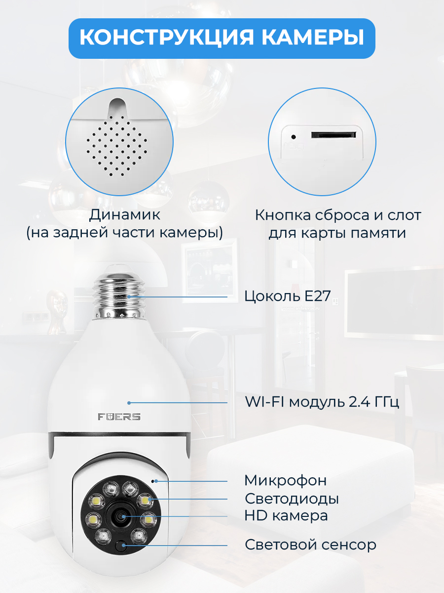 Камера-лампочка видеонаблюдения с цоколем E27, 128 Гб обеспечивает высококачественное видеонаблюдение в разрешении 3 мегапикселя и углом обзора 360 градусов. Этот умный светильник станет идеальным решением для мониторинга вашего дома или офиса.Высокое разрешение обеспечивает кристально чистое изображение, позволяя вам видеть мельчайшие детали происходящего. Благодаря панорамному обзору, вы сможете контролировать все уголки вашего помещения без слепых зон. Стандартный цоколь Е27 облегчает установку камеры и позволяет использовать ее в качестве обычного светильника. Устройство поддерживает Wi-Fi соединение, что позволяет просматривать видео с камеры на вашем смартфоне или компьютере в режиме реального времени. Встроенный инфракрасный датчик обеспечивает качественное изображение даже в условиях низкой освещенности или полного отсутствия света. Камера может отправлять уведомления на ваш смартфон при обнаружении движения, а также осуществлять запись видео на карту памяти или облачный сервис. Имеет простой и понятный интерфейс, который позволит быстро настроить и начать использование устройства.
